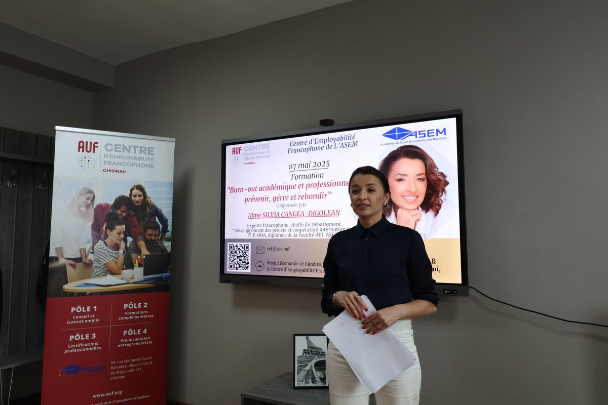 En mai 2025, le CEF de l'AÉÉM/ ASEM a offert une expérience unique, la formation : « Burn-out académique et professionnel : prévenir, gérer et rebondir ». Étudiants et enseignants ont exploré avec l’experte francophone Silvia CANGEA-DIGOLEAN, cheffe du département «Développement des projets et coopération internationale» à I.P. ODA, diplômée de l'ASEM, des clés concrètes pour reconnaître l’épuisement, rétablir l’équilibre et bâtir un plan de prévention durable. Entre théorie, ateliers interactifs et échanges ouverts, la formation a créé un espace d’écoute et de co-création. Message central : préserver sa santé mentale n’est pas un luxe, mais une compétence essentielle pour réussir et s’épanouir dans un monde académique et professionnel exigeant.