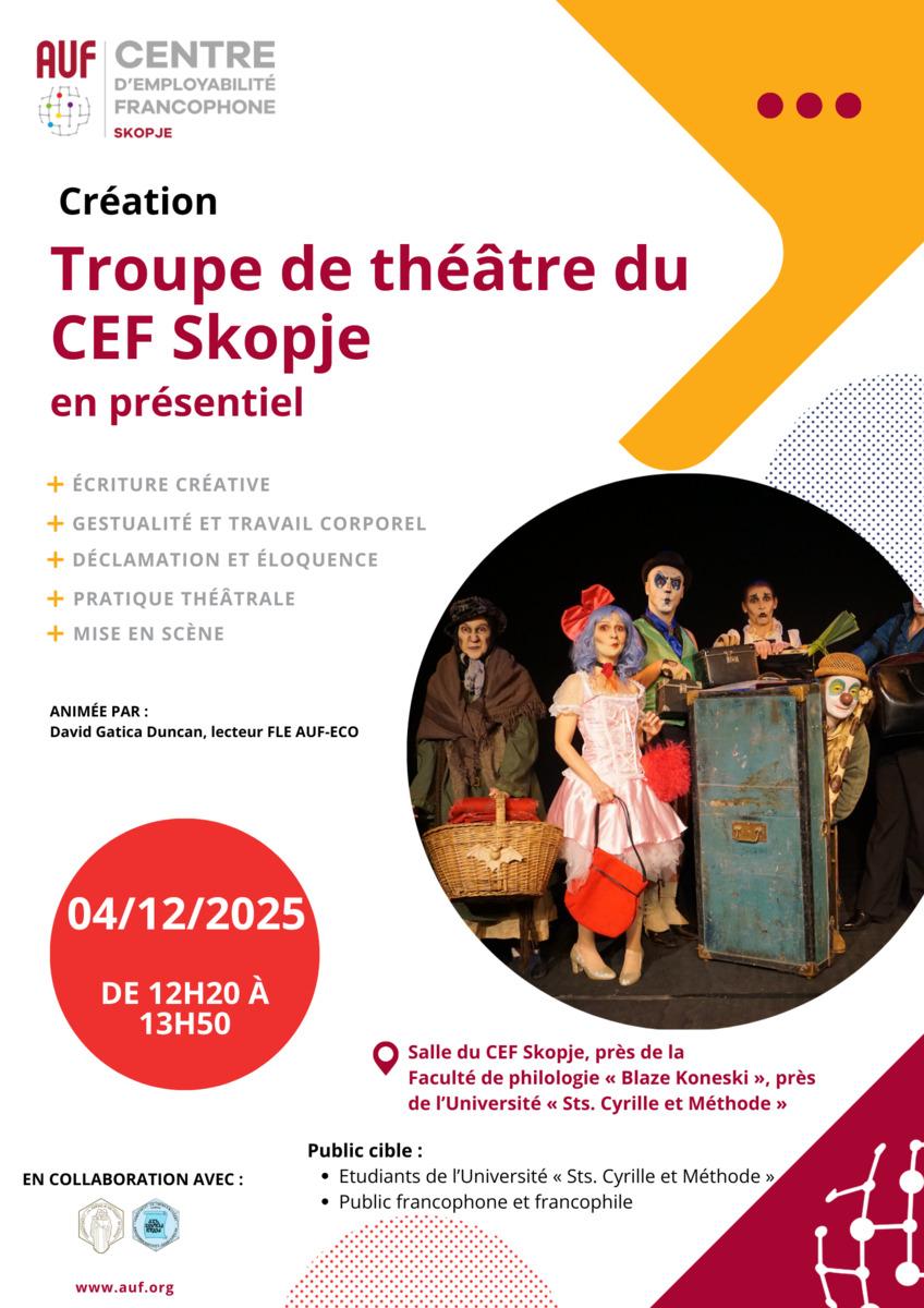 Le Centre d'Employabilité Francophone de Skopje vous invite à participer à la création de la troupe de théâtre du CEF. Cette initiative vise à former un groupe d'étudiants à la création et à la mise en scène de pièces de théâtre originales, et à la adaptation et représentation des pièces classiques.