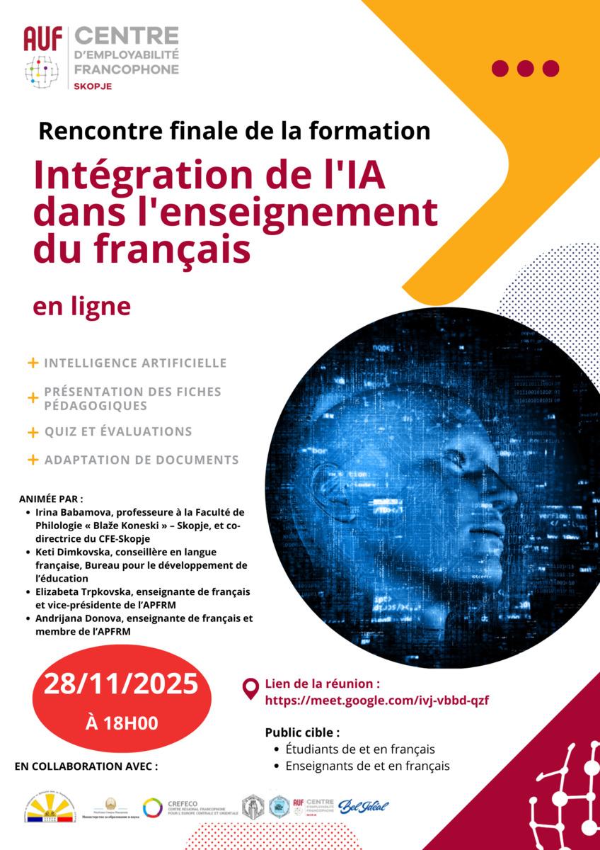 Le Centre d'Employabilité Francophone de Skopje a le plaisir de vous inviter à l’événement final après la dissémination de la formation « Intégration de l’intelligence artificielle dans l’enseignement du FLE », réalisé par l’APFRM en partenariat avec le CREFECO, la Fondation Belle Idéal, le Département de langues et littératures romanes, la Faculté de philologie « Blaze Koneski », le CEF Skopje, l'Université « Sts. Cyrille et Méthode » et l’OIF.